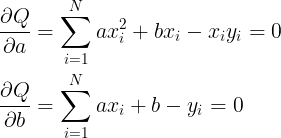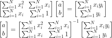%5E%7B-1%7D&space;%5Cbegin%7Bbmatrix%7D&space;x_%7B1%7D&space;&&space;x_%7B2%7D&space;&&space;x_%7B3%7D%5C%5C&space;1&space;&&space;1&space;&&space;1&space;%5Cend%7Bbmatrix%7D&space;%5Cbegin%7Bbmatrix%7D&space;y_%7B1%7D%5C%5C&space;y_%7B2%7D%5C%5C&space;y_%7B3%7D&space;%5Cend%7Bbmatrix%7D%5C%5C&space;&%5Cbegin%7Bbmatrix%7D&space;a%5C%5C&space;b&space;%5Cend%7Bbmatrix%7D&space;=&space;%5Cbegin%7Bbmatrix%7D&space;%5Csum_%7Bi=1%7D%5E%7BN%7Dx_%7Bi%7D%5E%7B2%7D&space;&&space;%5Csum_%7Bi=1%7D%5E%7BN%7Dx_%7Bi%7D%5C%5C&space;%5Csum_%7Bi=1%7D%5E%7BN%7Dx_%7Bi%7D&space;&&space;%5Csum_%7Bi=1%7D%5E%7BN%7D1&space;%5Cend%7Bbmatrix%7D&space;%5E%7B-1%7D&space;%5Cbegin%7Bbmatrix%7D&space;%5Csum_%7Bi=1%7D%5E%7BN%7Dx_%7Bi%7Dy_%7Bi%7D%5C%5C&space;%5Csum_%7Bi=1%7D%5E%7BN%7Dy_%7Bi%7D&space;%5Cend%7Bbmatrix%7D&space;%5Cend%7Balign*%7D)